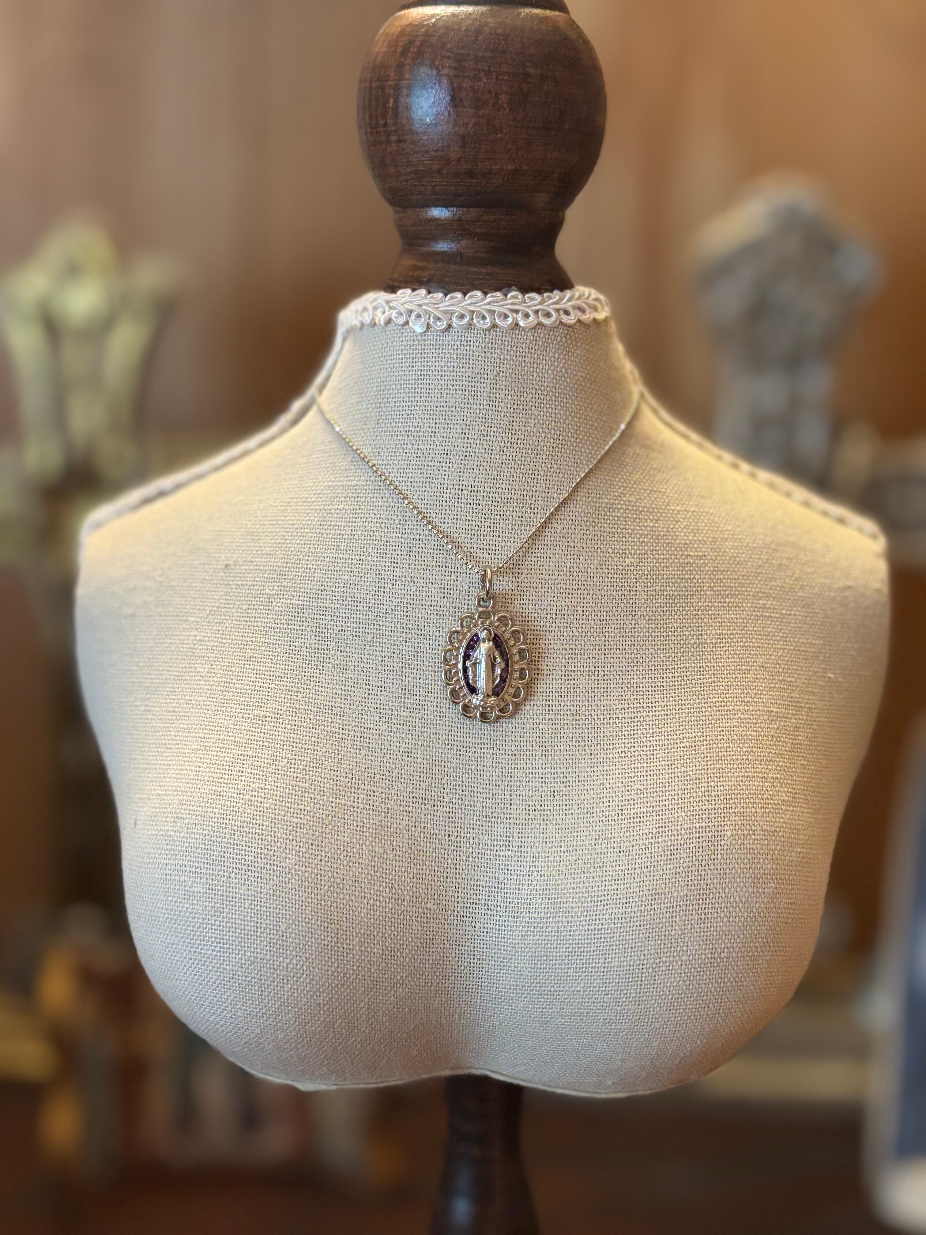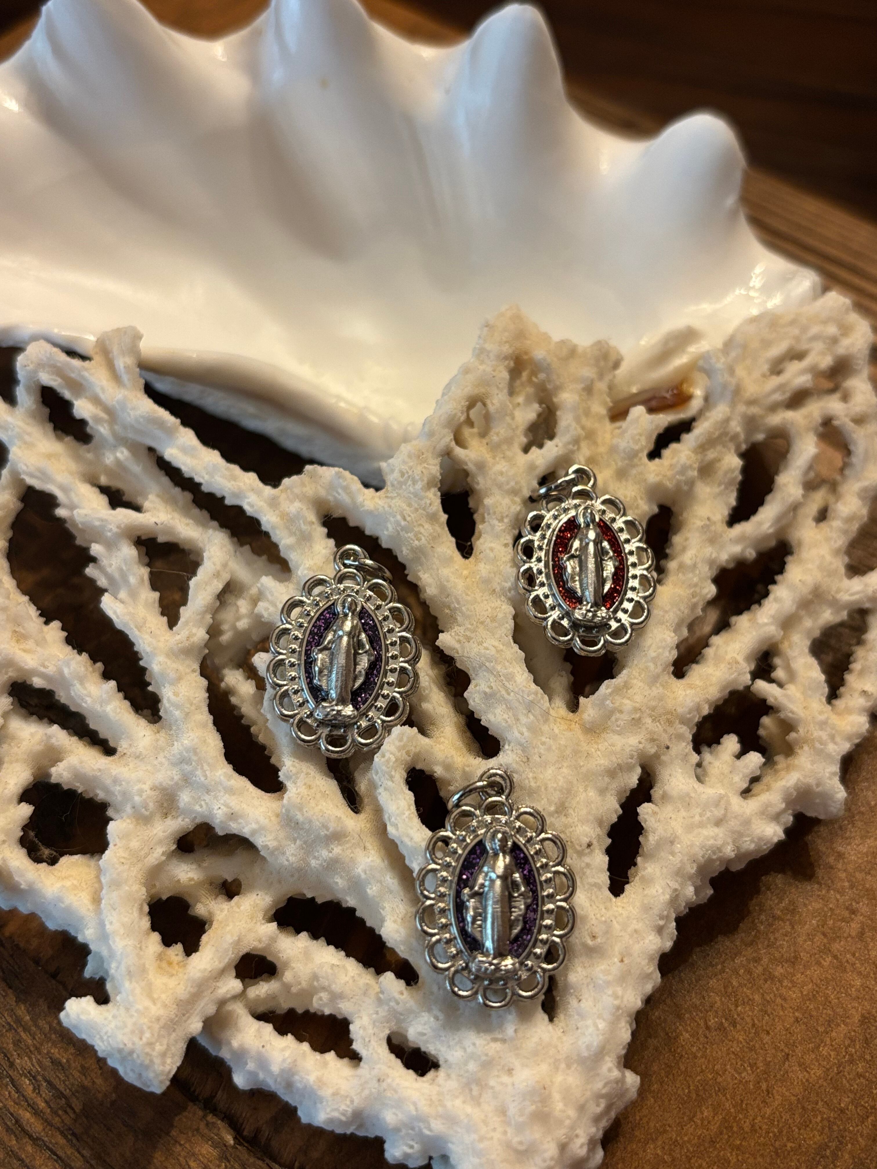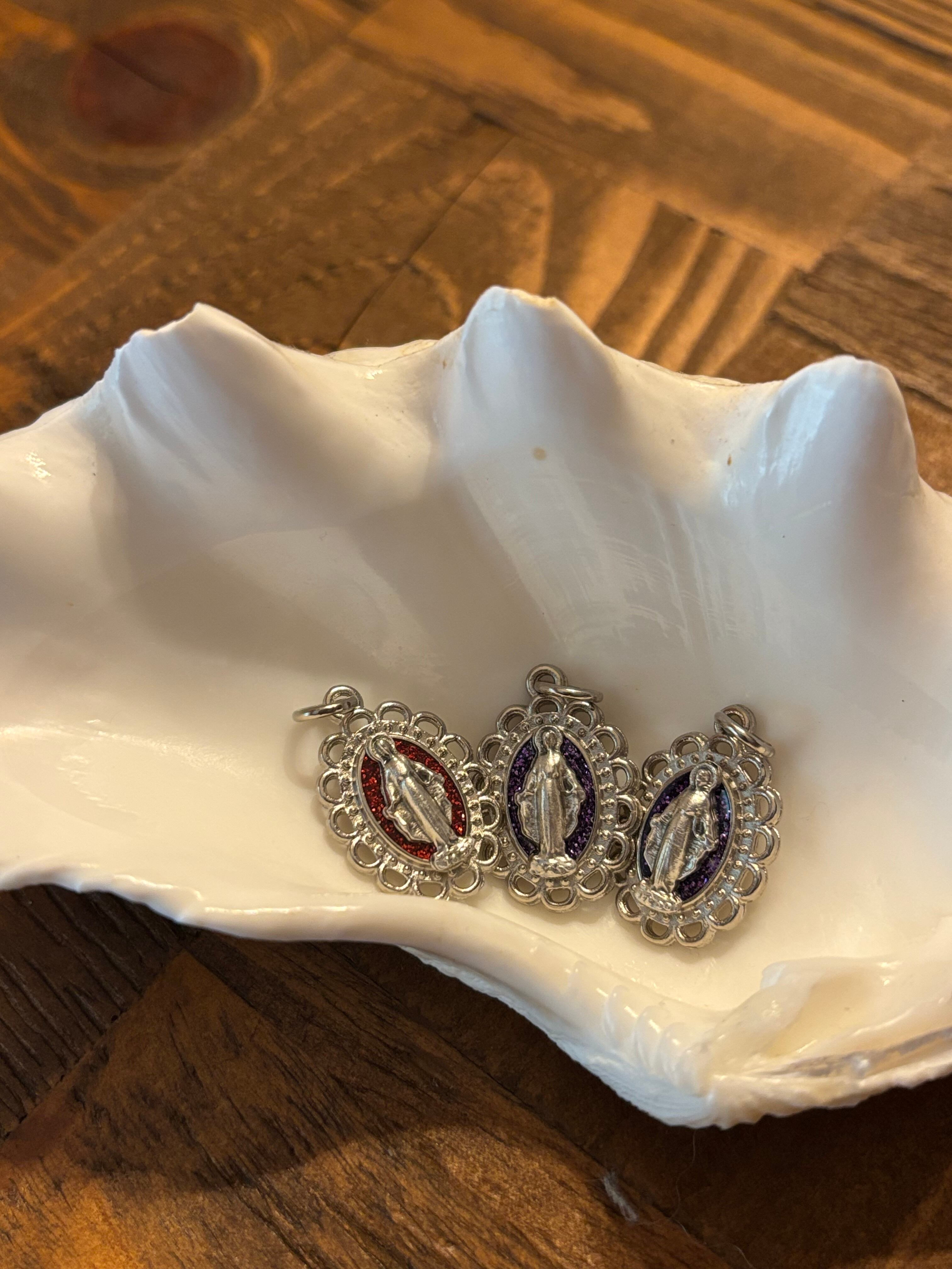 光に当たるとキラキラと紫色が輝きを放つメダイユです。